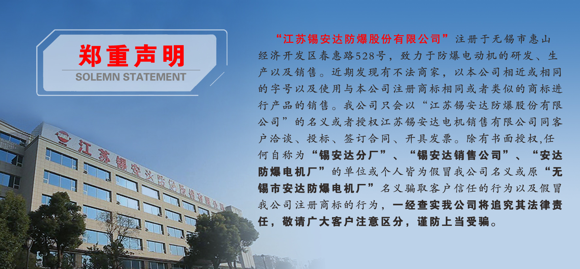 公司主要生產(chǎn)高低壓防爆電動機(jī)和防爆電動葫蘆,是中國防爆電機(jī)科研生產(chǎn)基地之一,占地面積11萬平方米,擁有現(xiàn)代化的生產(chǎn)車間、先進(jìn)的加工設(shè)備和完善的檢測能力。具有1000萬千瓦防爆電動機(jī)和3000臺防爆電動葫蘆的生產(chǎn)能力,注冊商標(biāo)為“錫安達(dá)”。產(chǎn)品主要用于石油、化工、煤炭、冶金、水利、電力、糧食、軍工等領(lǐng)域。